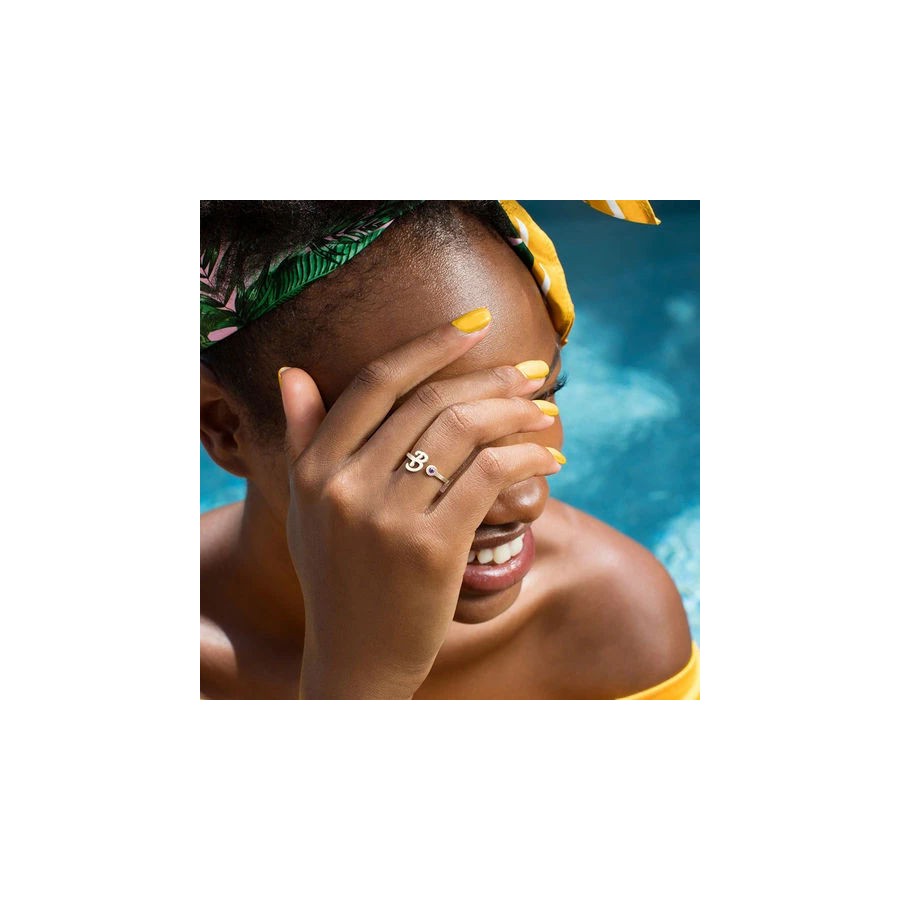 A simple and delicate name ring. With the initial of your choice and a birthstone, it will remind you of someone important to you. It is perfect for all women and teenagers. It represents love, friendship and life. It is suitable for all styles of clothing and is worn for everyday and special occasions.