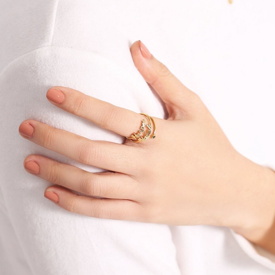 A simple and delicate name ring. With two names of your choice and a birthstone, it will remind you of people important to you. It is perfect for all women and teenagers. It represents love, friendship and union. It is suitable for all styles of clothing and is worn for everyday and special occasions.