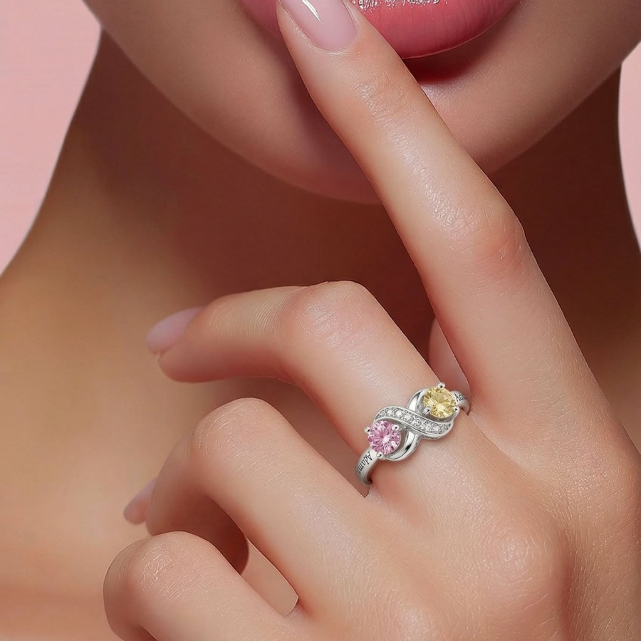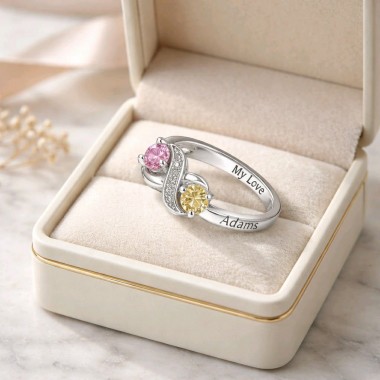 Cette magnifique bague est l'une des bagues promesse la plus simple et la plus populaires qui soit sur notre boutique. Son design unique, et ses deux magnifiques pierres de naissance fait de véritables cristaux de Swarovski, sauront comblé le cœur de l'être aimé. Elle est robuste et sa conception fait d'elle une bague résistante aux travaux quotidiens. Cette bague est délicate et raffinée comme on les aiment! Une bague parfaite pour la grande demande qui représente l'amour entre deux personnes pour la vie.